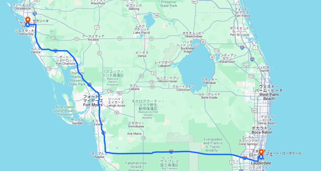 今回は都市間移動(Sarasota→Fort Lauderdale:約350km)があったためレンタカーも検討しましたが、